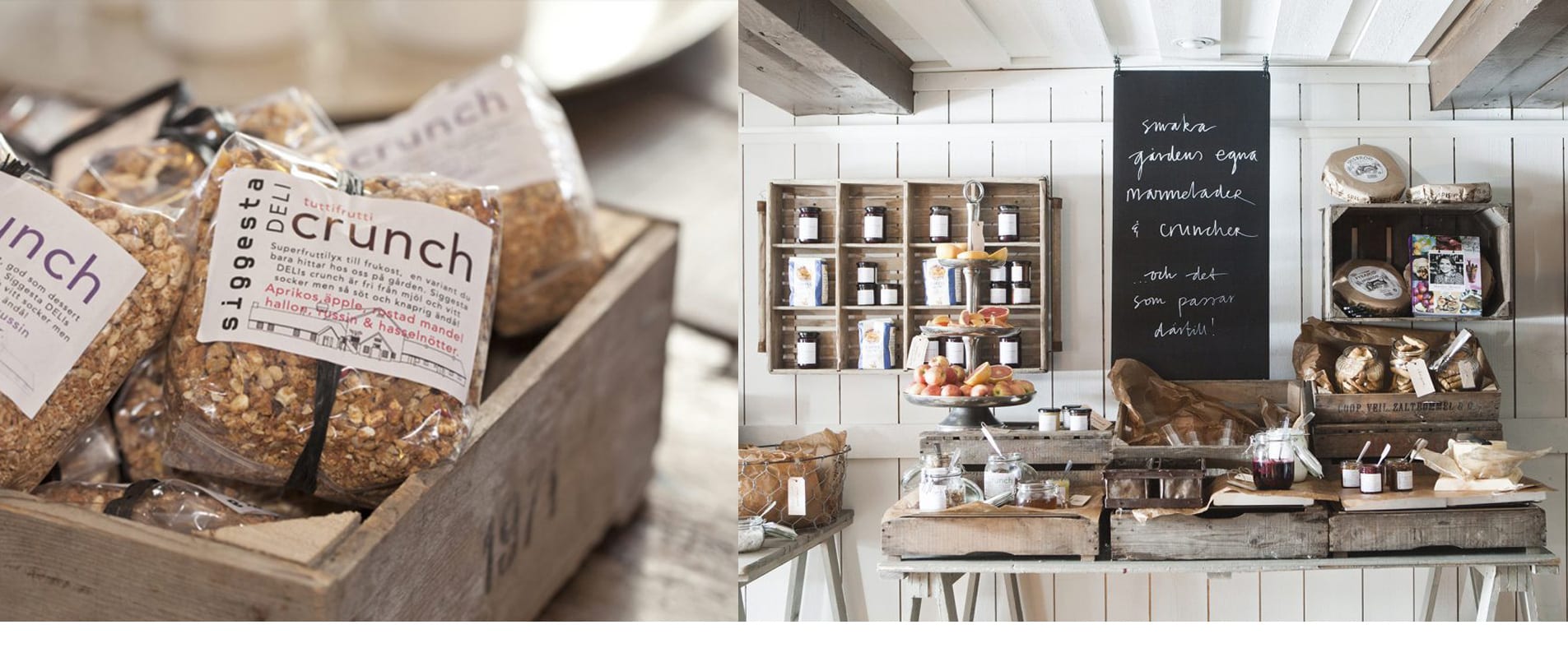 Siggesta har en liten mysig delikatessbutik på gården där det mesta som säljs är tillverkat av gårdens egna kockar och bagare. Charlotte som ansvarar för smaker och innehåll är noga med att välja de bästa råvarorna då vi vill att du ska må bra av att äta det vi tillverkar helt enkelt. I delibutiken hittar du våra egna produkter från gårdens kök och bageri men också härliga produkter från andra leverantörer, allt noga utvalt efter smak och design.